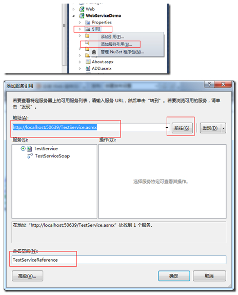 b) 弹出框地址填写: http://localhost:50639/TestService.asmx, (注意:这里要换成你自己刚运行的服务地址)
