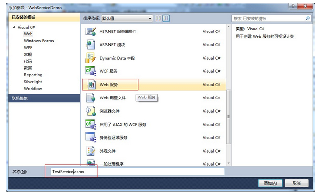 2.在刚创建的web程序里添加一个WebService服务文件,名称为TestService.asmx, 步骤看截图
