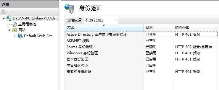 首先打开IIS,然后双击右侧“身份验证”,会显示出当前IIS支持的所有的身份验证方式(由于我安装IIS时候,在“安全性”那里我是全部勾选的)。可以看到如图: