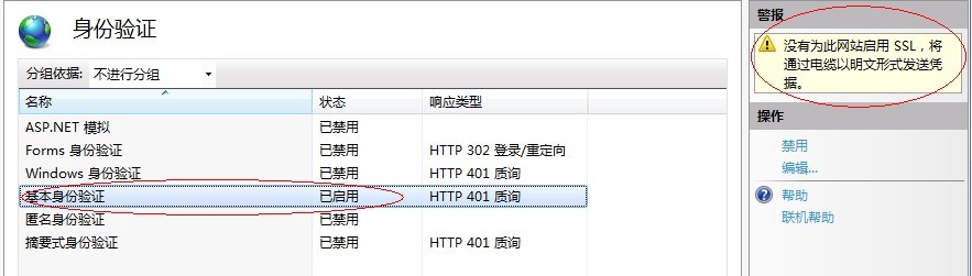 首先把其他的身份验证方式全部禁用掉,然后仅仅启用“基本身份验证”。有图有真相: