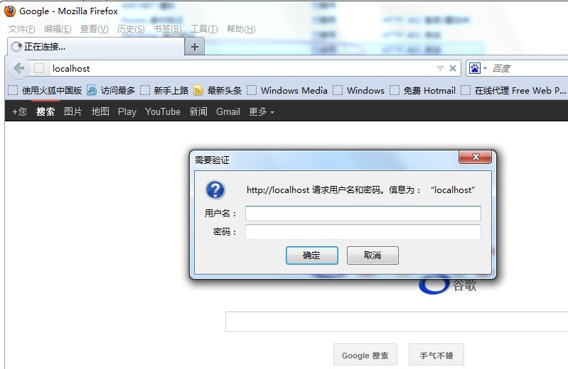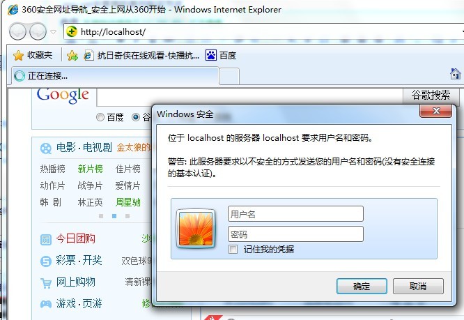然后打开IE、FireFox、chrome等浏览器,敲入localhost,等待打开IIS上的默认网站。你会发现,浏览器端都会弹出提示框信息,而且在不同浏览器上弹出框的样式和表现形式也有所差异。(长期不用IE,发现360这个老流氓把哥的首页给改了,还号称”安全上网“,这明显是篡改行为嘛。搞不懂。)