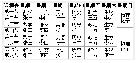 GridView,ASP.NET中很常用的数据显示控件,这里,我将用这个控件来实现课程表的显示。首先说说课程表的显示与普通记录的显示有何不同?这里所说的普通记录是指直接从数据库中查询出来的、没有经过任何处理的记录。通常,我们用GridView显示这些普通记录,只需直接将这些记录表绑定到GridView中即可。但是,课程表的显示可不是这么简单,它需要将普通记录继续加工,需要根据记录中具体的数据来确定数据需要显示在哪一行、哪一列,而且需要根据课程开始时间和结束时间动态合并单元格,最后才是数据的显示。这就是课程表显示的难点之所在。好了,下面就看看我是如何实现的吧。