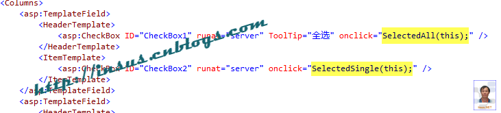 在上面的html代码中,可以看有两个CheckBhox,一个是放在GridView的HeaderTemplate模版上为了全选,另一个是放在ItemTemplate模版上为了单选。
