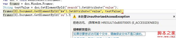 我们运行我们的测试程序后,加载之前我们自己写的页面后,在自己的页面上输入我们要查询的词,点击测试按钮,就会看到程序报未处理 UnauthorizedAccessException错误: