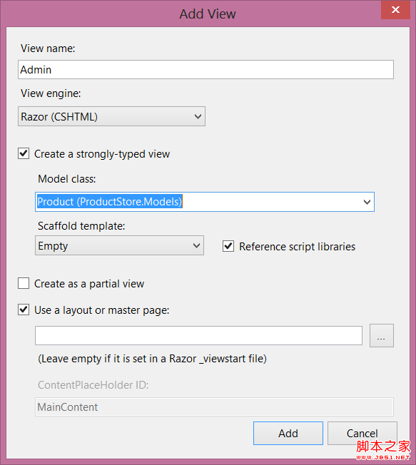 在“添加视图”对话框中,将此视图命名为“Admin”。选中标签为“创建强类型视图”的复选框。在“模型类”下面,选择“Product (ProductStore.Models)”。保留所有其它选项为其默认值(如图2-21)。