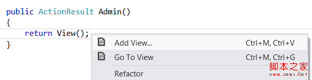 Next, position the text cursor within the Admin action method, then right-click and select Add View. This will bring up the Add View dialog.