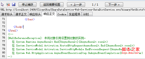 这里我们得到的是一个500错误,知道了是请求.svc时出错了。双击查看响应正文或者直接复制请求url到浏览器访问可以得到更详细的出错信息: