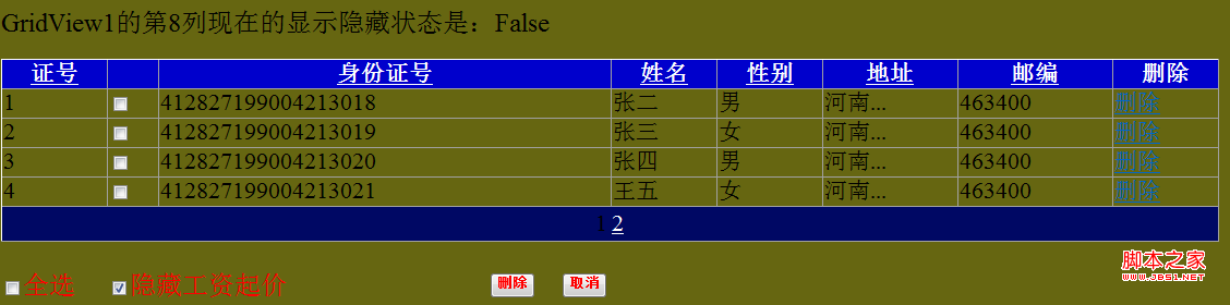 Response.Write("GridView1的第8列现在的显示隐藏状态是:" + GridView1.Columns[7].Visible.ToString());