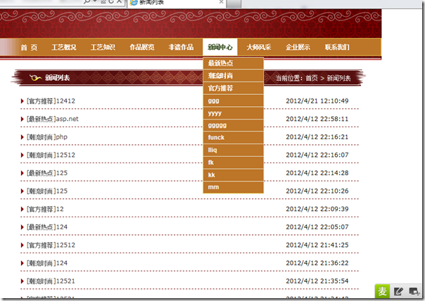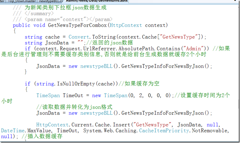 总结:这样我们一个简单的新闻类别就实现了,虽然简单,但是一个高性能可扩展的网站,更为重要的是主体架构,在这里ajax通过json传输数据,后台通过ashx页面实现,实现了业务与数据的分离,后台只负责数据的供应,前台实现数据的展示,这种UI与数据的分离,是网站架构的第一步.