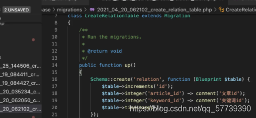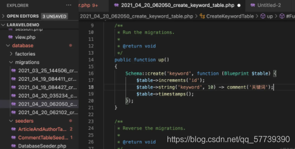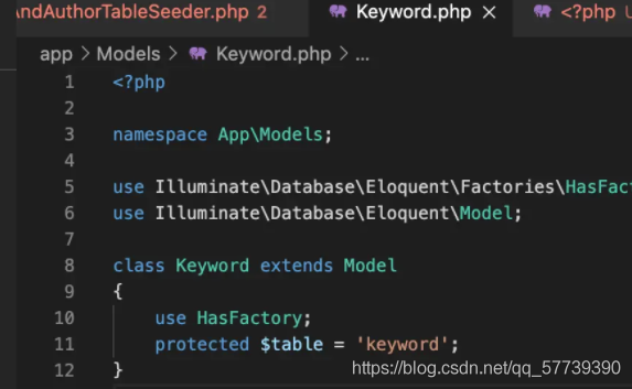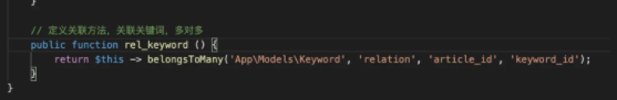 上述语法提及到的关系键是指在关系表中的字段名。 创建关键词模型: php artisan make:model Keyword