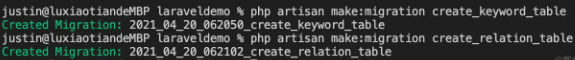 执行迁移php artisan migrate |