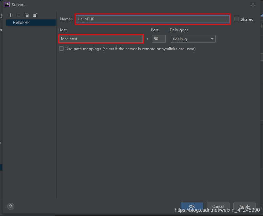 IED key输入刚刚php.ini文件中xdebug.idekey的值,Host、Port是File->Settings->LanguagesFrameworks->PHP->Servers中设定的Host、Port值,具体配置如下图: