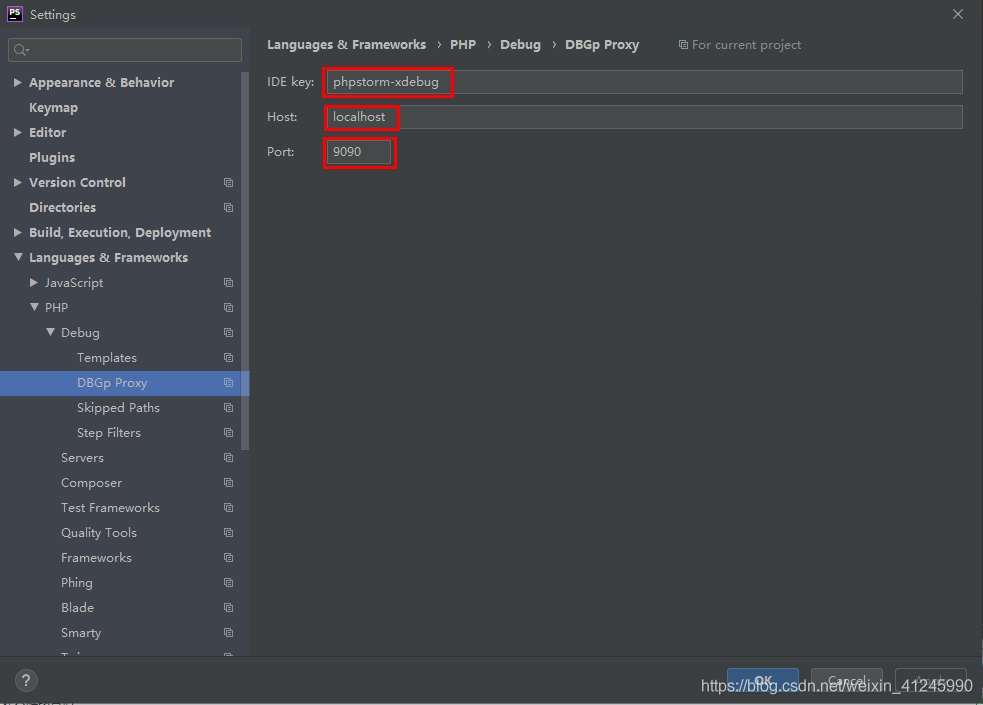 2)选择File->Settings->LanguagesFrameworks->PHP->Debug->DBGp Proxy,