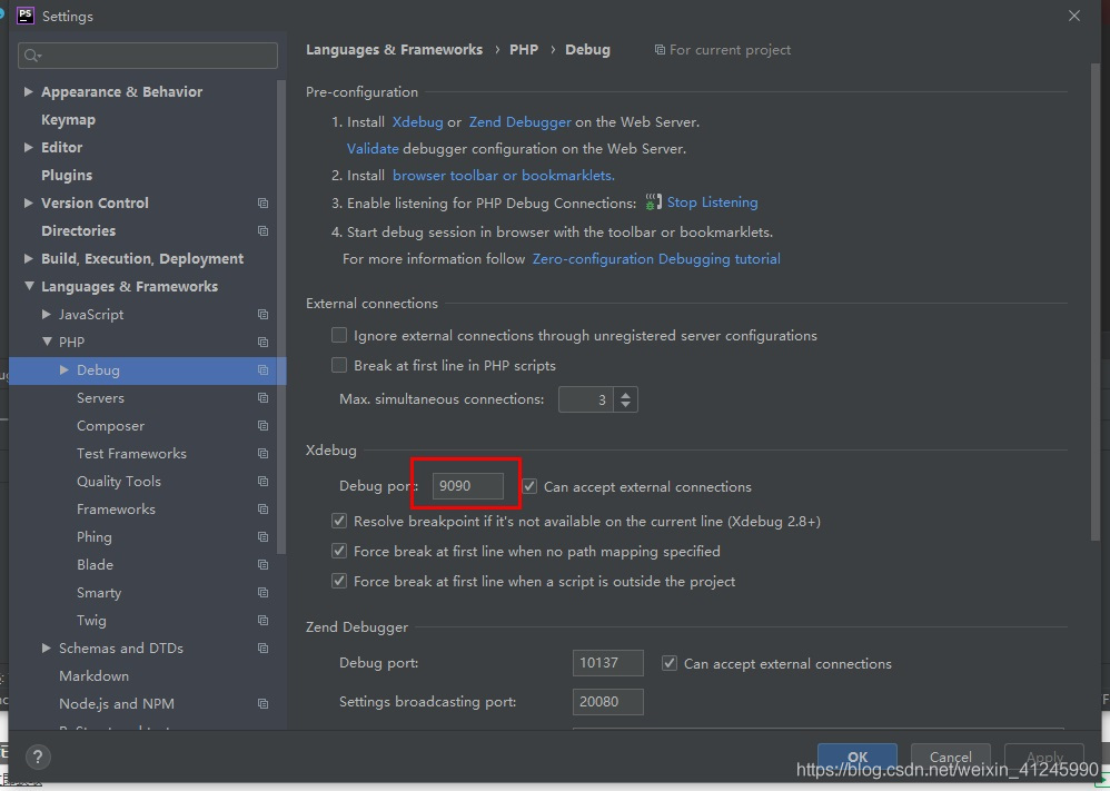 1)选择File->Settings->LanguagesFrameworks->PHP>Debug,找到XDebug选项卡,Debug port 输入的是刚刚php.ini配置文件当中xdebug.remote_port的值,具体配置如下图: