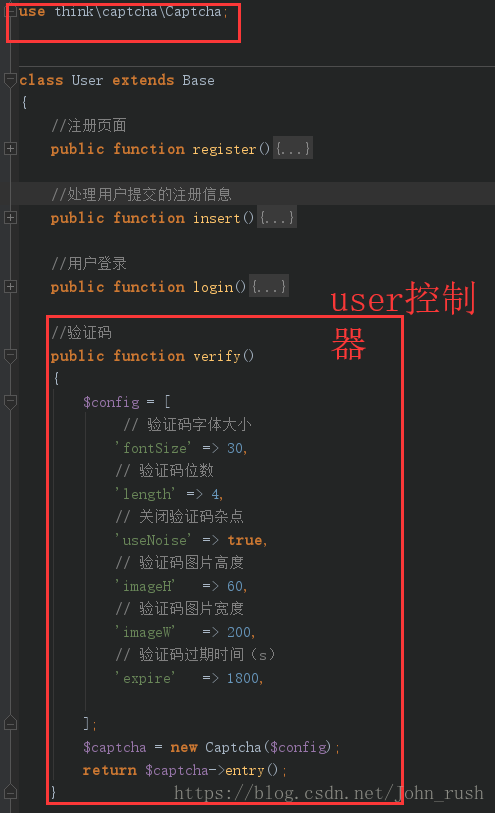三、在控制器里写验证码的方法,要在命名空间引入use think\captcha\Captcha;然后在网址中输入该方法的路由地址就可以出来验证码
