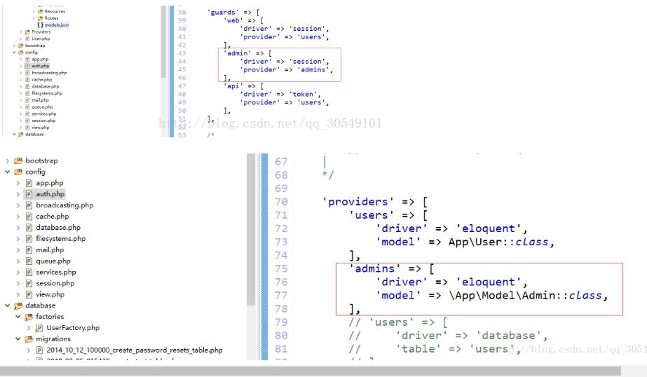 首先在config/auth.php中添加配置,框架默认都是走的自带的User模块。