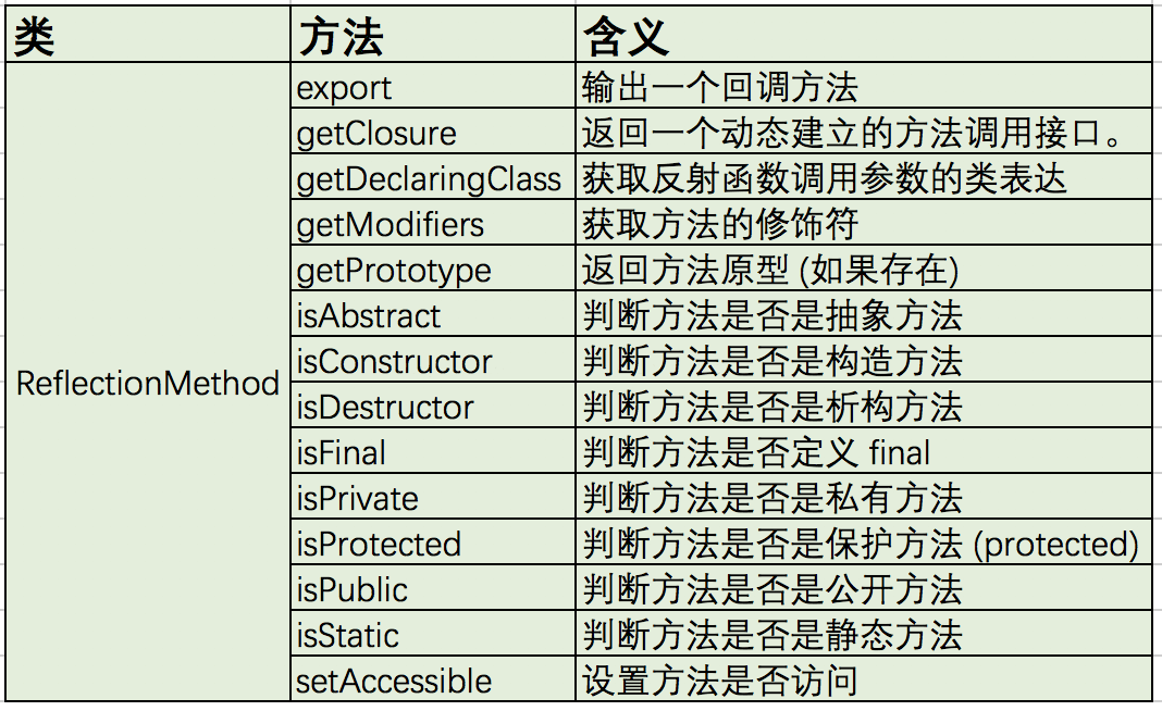 (1) $reflectMethod = new ReflectionMethod(方法名>);