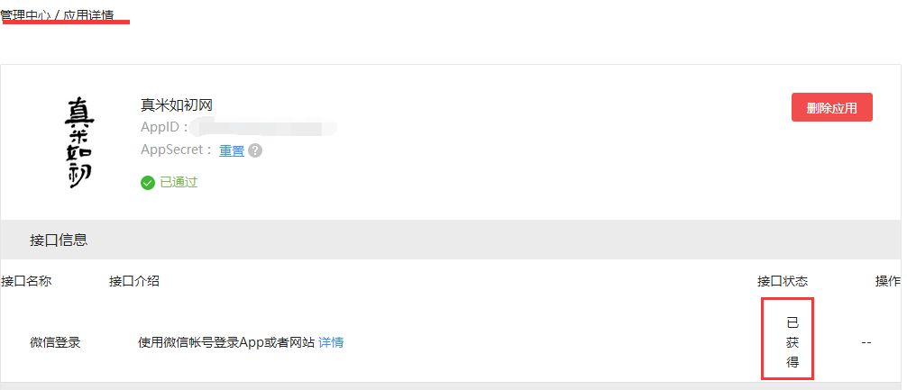 • 当应用创建通过后,必须还要满足接口权限的获取,会有工作人员主动联系,一般一天就能完成