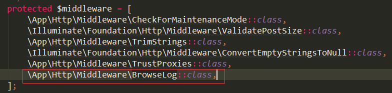 定义一个全局中间件,每一次请求都会被执行。执行 php artisan make:middleware BrowseLog,创建了 app/Http/Middleware/BrowseLog.php 文件。