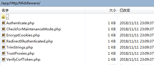 Laravel的中间件在 /app/Http/Middleware 目录下,用于过滤HTTP请求,可以做一些字段验证、身份验证、CSRF 防护等等......
