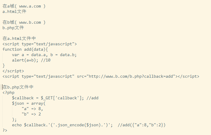 这上图中 a.html中请求了 http://www.b.com/b.php?callback=add (在ajax程序中请求url就是这个链接),在b.php中读取了传过来的参数 callback=add 根据获取到的参数值(值为add),以JS语法生成了函数名,并把json数据作为参数传入了这个函数,返回以JS语法生成的文档给a.html,a.html解析并执行返回的JS文档,调用了定义好的add函数。
