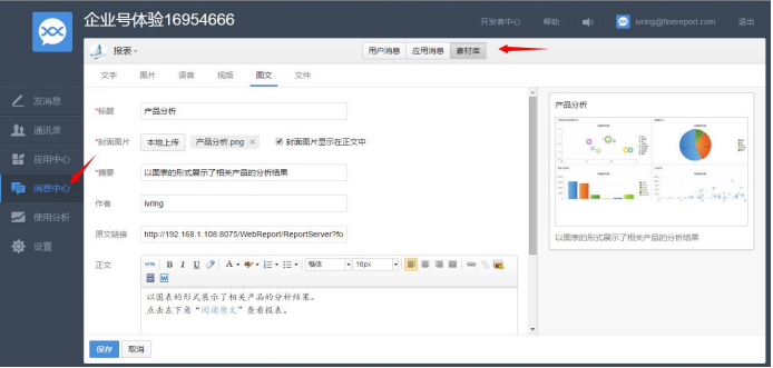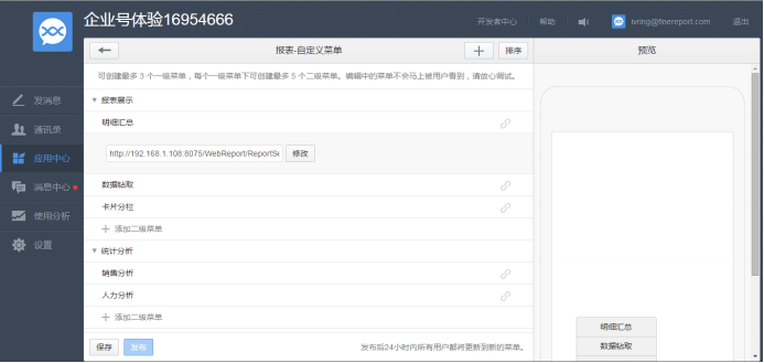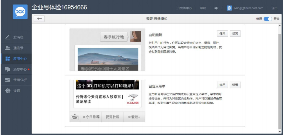 有时候我们希望把想查询的数据和微信企业号平台集成,或者我们希望能在微信端,将微信中的账户与对应数据集中的字段关联,并通过访问报表获取要查询的字段信息,就好比各个营业厅查询个人当前【套餐余量】。又或者,我们希望能够更加方便的编辑自动回复。如果将报表与公众号集成这些需求都可以实现。下面我就来介绍一下该如何集成。
