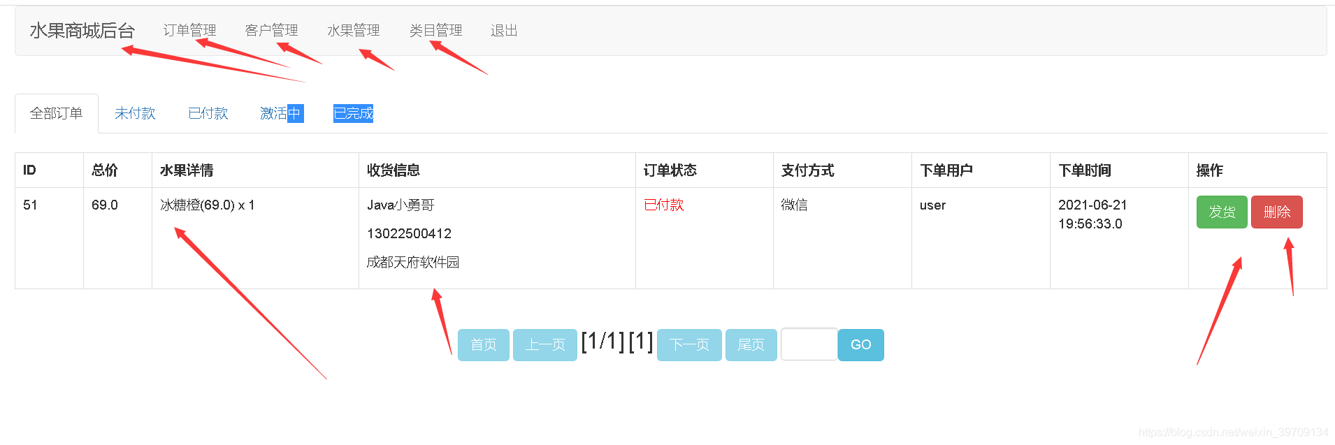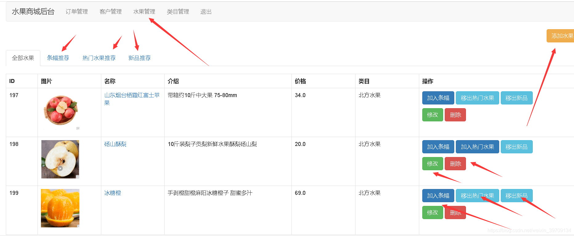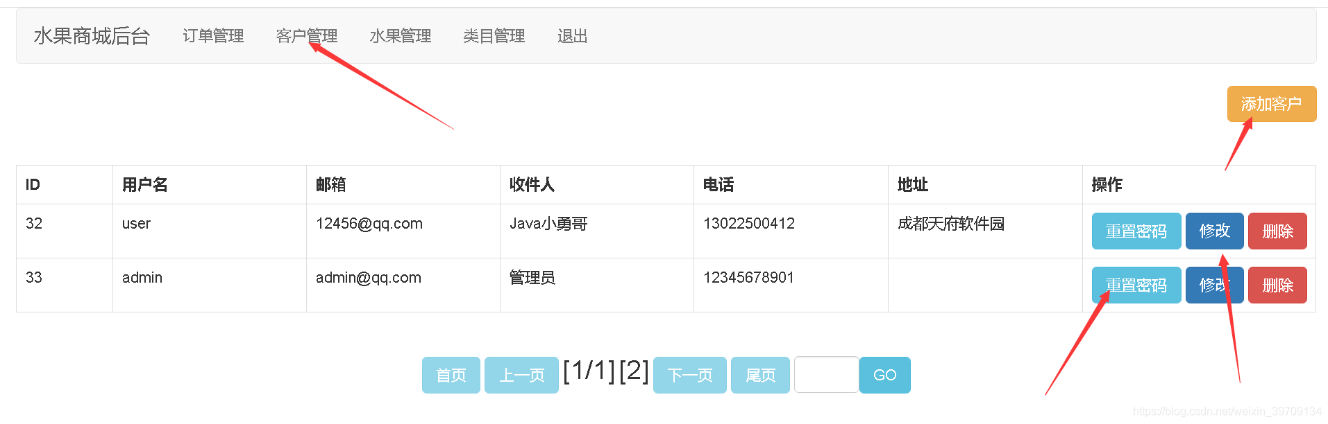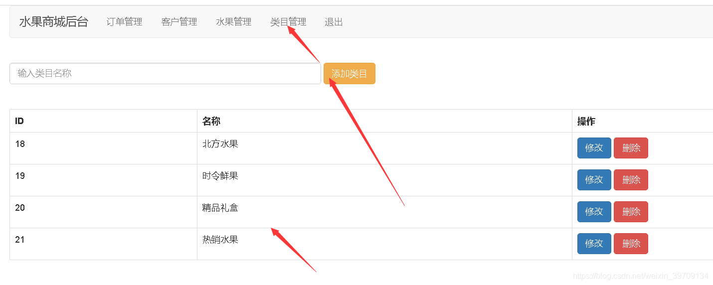 管理员登录,订单管理,客户管理,水果管理,商品类目管理等功能。