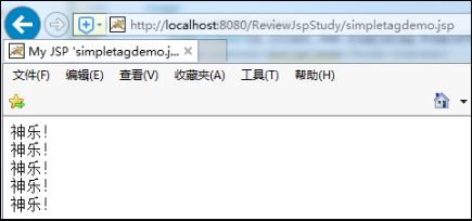 最后就能在JSP页面的主体中使用刚才定义好的带属性的简单标签了,使用“count”属性就能指定标签体循环的次数: