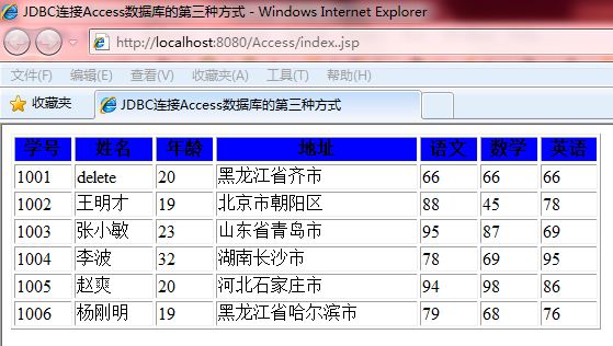 %@ page language="java" import="java.util.*,java.sql.*" contentType="text/html; charset=UTF-8" pageEncoding="UTF-8"%>!DOCTYPE html PUBLIC "-//W3C//DTD HTML 4.01 Transitional//EN" "http://www.w3.org/TR/html4/loose.dtd">html> head> title>JDBC连接Access数据库的第三种方式/title> /head> body> table border="1" width="40%"> tr bgcolor="blue"> th>学号/th> th>姓名/th> th>年龄/th> th>地址/th> th>语文/th> th>数学/th> th>英语/th> /tr> % String path = application.getRealPath("/index.jsp"); path = path.substring(0,path.lastIndexOf("\\"))+"\\"; Class.forName("sun.jdbc.odbc.JdbcOdbcDriver"); String url = "jdbc:odbc:driver={Microsoft Access Driver (*.mdb)};DBQ="+path+"student.mdb "; Connection con = DriverManager.getConnection(url); Statement st = con.createStatement(); String sql = "select * from basic"; ResultSet rs = st.executeQuery(sql); while(rs.next()) { %> tr> td>%=rs.getString(1) %>/td> td>%=rs.getString(2) %>/td> td>%=rs.getInt(3) %>/td> td>%=rs.getString(4) %>/td> td>%=rs.getInt(5) %>/td> td>%=rs.getInt(6) %>/td> td>%=rs.getInt(7) %>/td> /tr> % } rs.close(); st.close(); con.close(); %> /table> /body>/html>