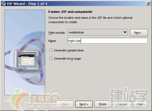 Generate sample bean选项勾选后JBuilder将生成一个示例的Bean并在JSP中引入这个Bean。对于初学者来说,可以通过该选项查看JSP如何引用一个Bean,而Generate error page选项将自动为JSP创建一个配套的错误处理JSP文件,这里,我们不勾选它们。