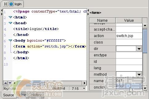 属性编辑器是动态的,光标移到不同的标签上,属性编辑器就显示这个标签所有可设置的属性。如上图中对应的是HTML 表单标签的属性编辑器,我们将其action属性设置为switch.jsp,指定用POST方式发送请求数据。