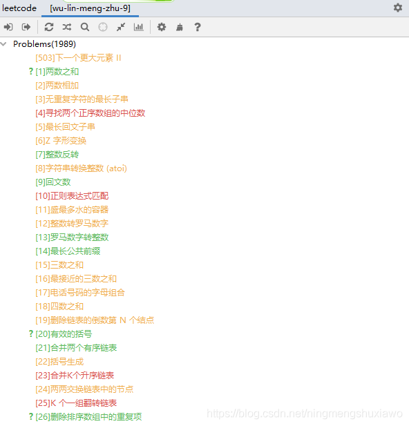 第一个 Problems 为所有的题目,题目标题按难易程度分别用不同的颜色进行标识,绿色表示容易,黄色表示中等,红色表示困难。