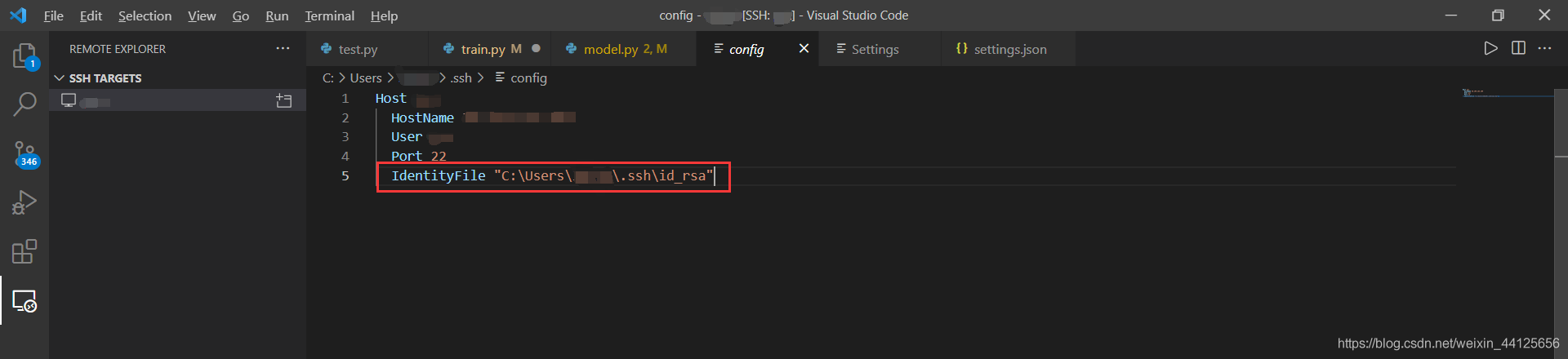 3.回到VSCode,在Remote -SSH的config文件中添加私钥的信息: