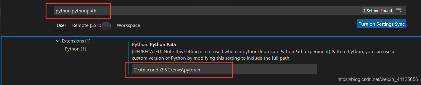 在搜索框输入python.pythonpath,并在下方输入框中填入Anaconda的安装路径