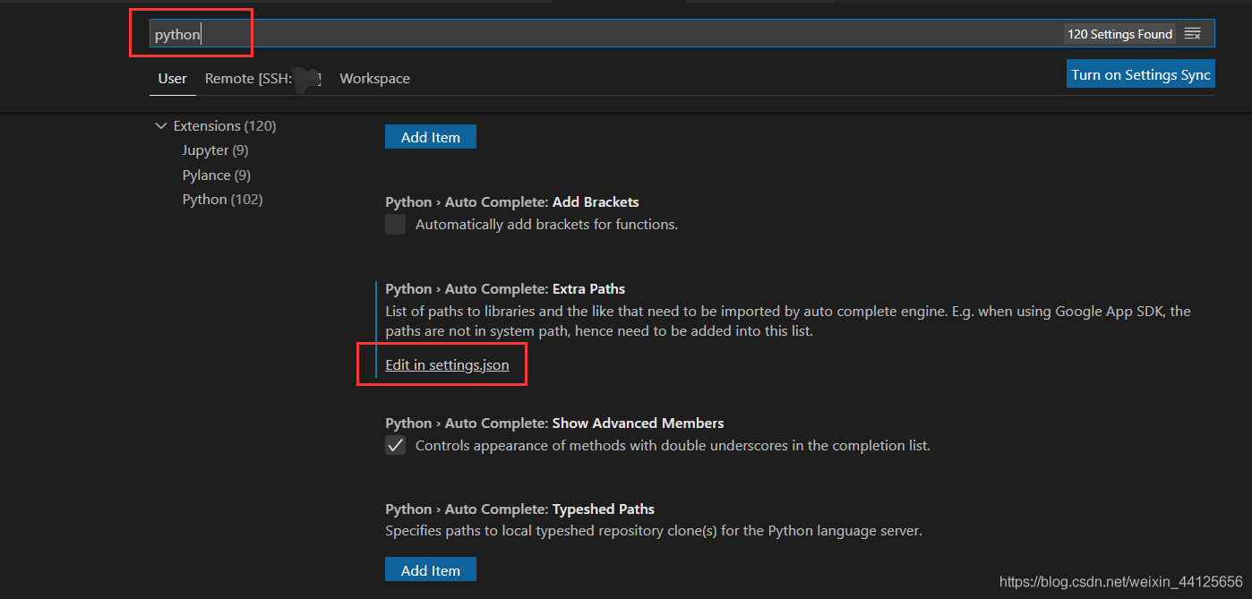 如果搜索框搜不出python.pythonpath,记得要先在Extensions中安装python和code runner。 也可以搜索python,在settings.json中修改: