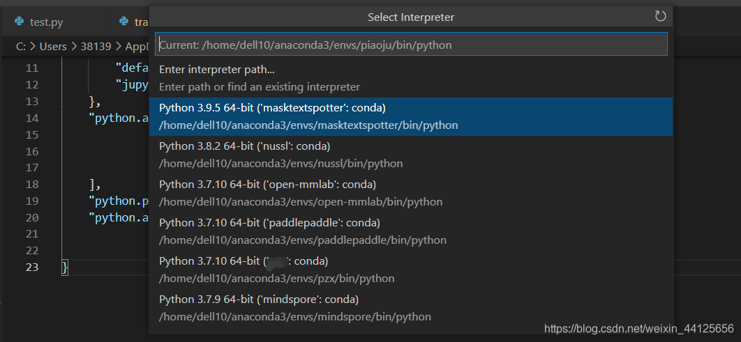 选择特定的解释器:control+shift+P,在输入框中输入Python:Select Interpreter并回车,就可以选择环境。