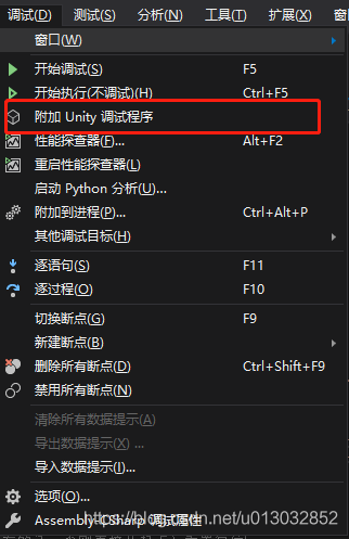在顶部菜单栏中“调试”->“附加到Unity调试程序”