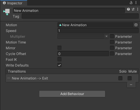 Motion | 状态对应的动画。每个状态的基本属性,直接选择已定义好的动画(Animation Clip)即可 |