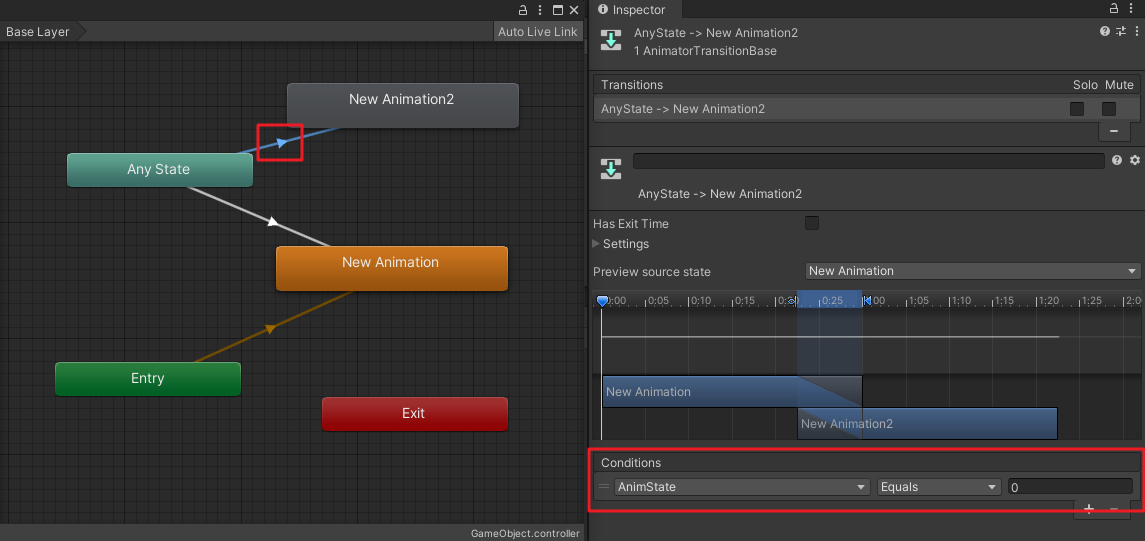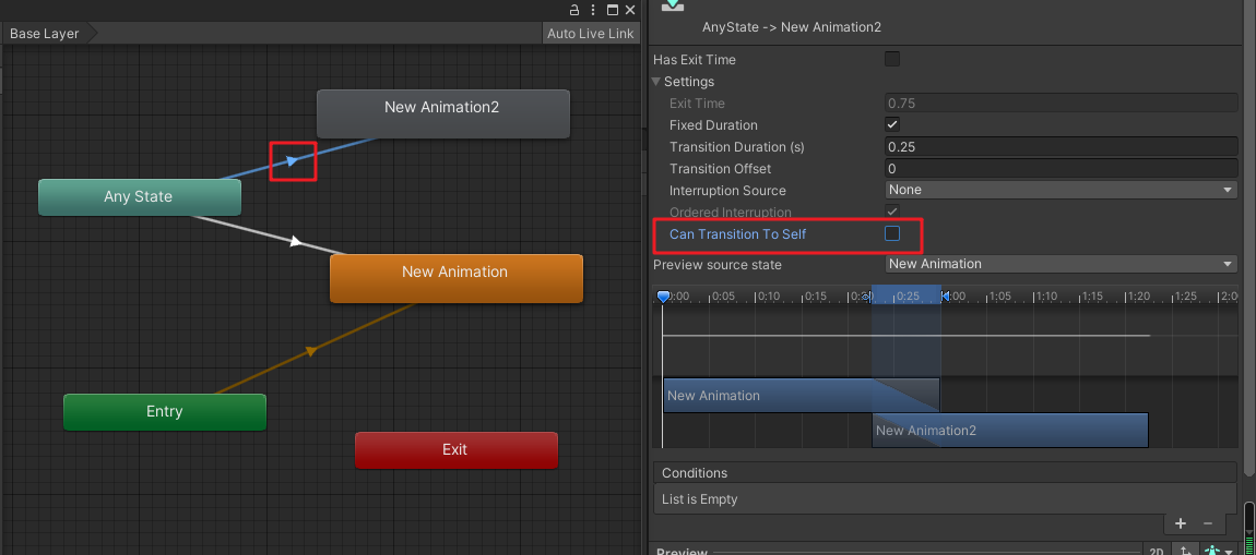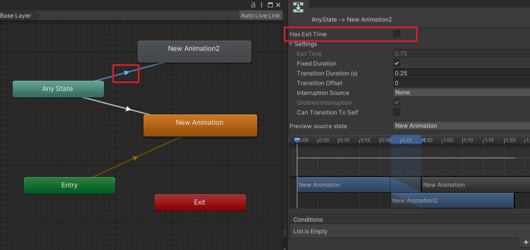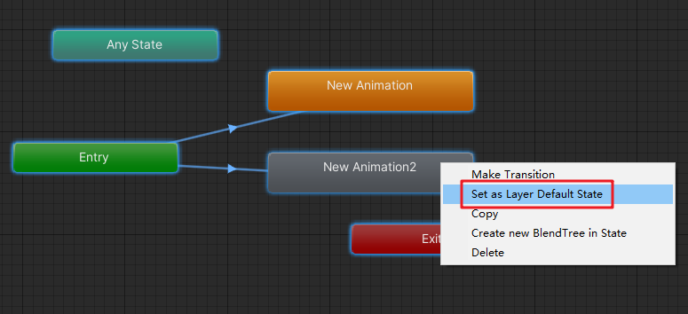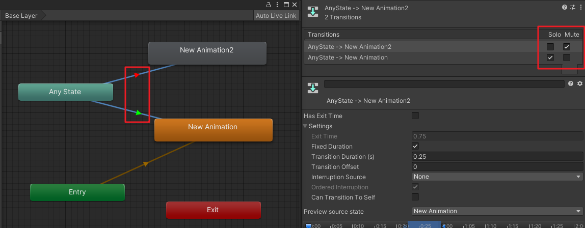 Transitions | 该状态向其他状态发起的过渡列表,包含了Solo和Mute两个参数,在预览状态机的效果时起作用 |