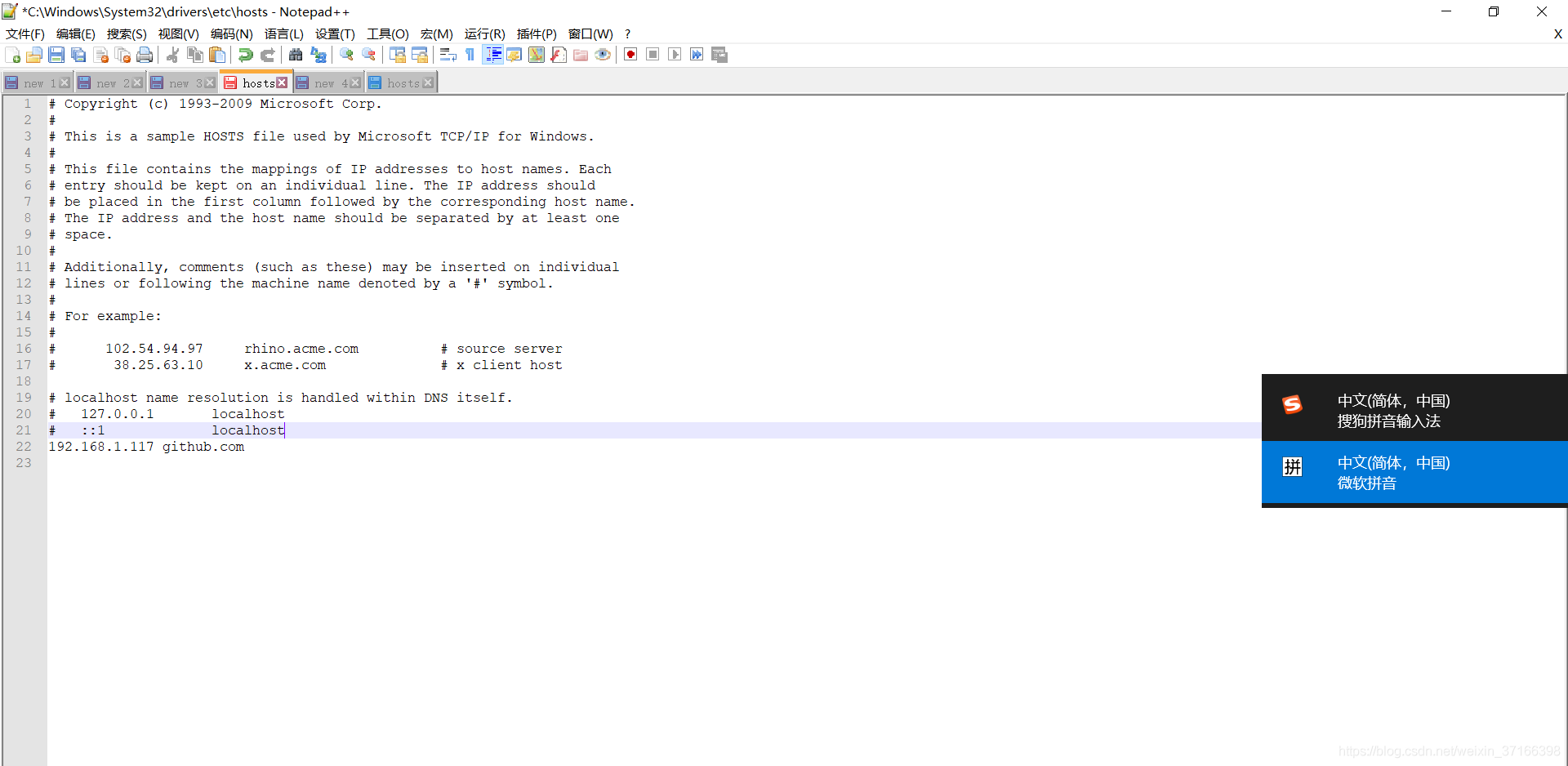 在该文件下 添加 192.168.1.117 github.com