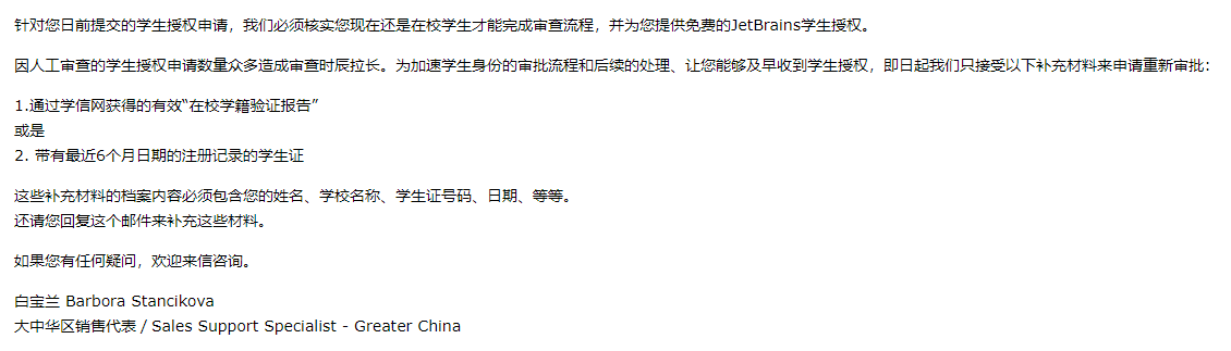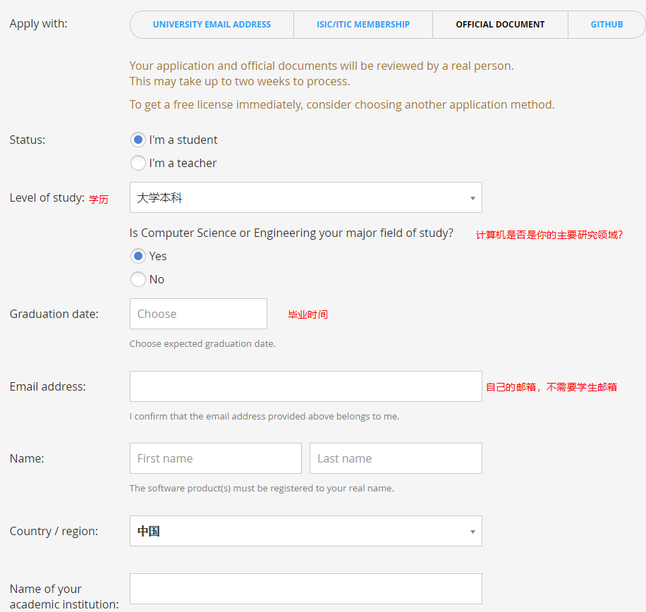 根据图片中的注释完成学生认证的申请既可以,注意学生证的照片要拍清晰,可以上传不止一张照片。填写的电子邮箱也将是以后JetBrains的账号。