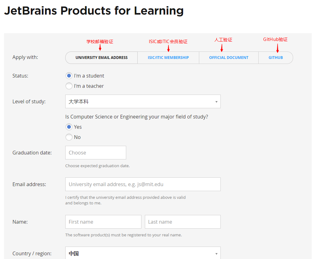 首先打开JetBrains关于学生认证的网站:https://www.jetbrains.com/shop/eform/students,可以看见以下页面: