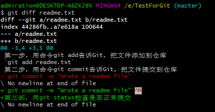 可以让我们知道有没有正常提交,比如上面那个例子,但如果要查看文件到底修改了什么内容,可以使用git diff 文件名