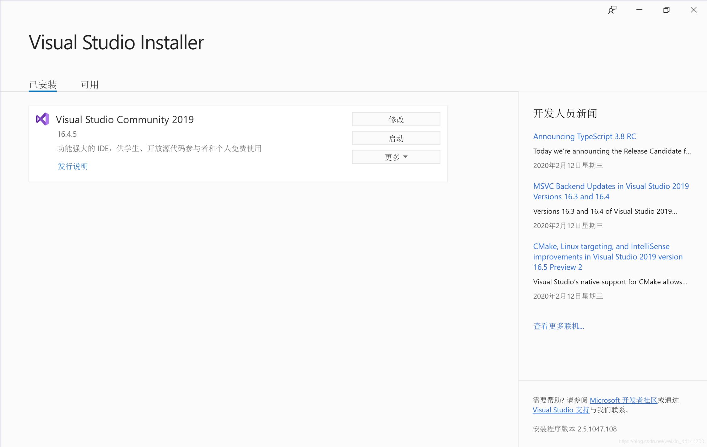 打开Visual Studio Installer(在电脑应用里找就行,安装vs2019肯定少不了它),得到如下界面,点击修改(如果提示你需要更新vs,你只能更新完vs才有修改选项)