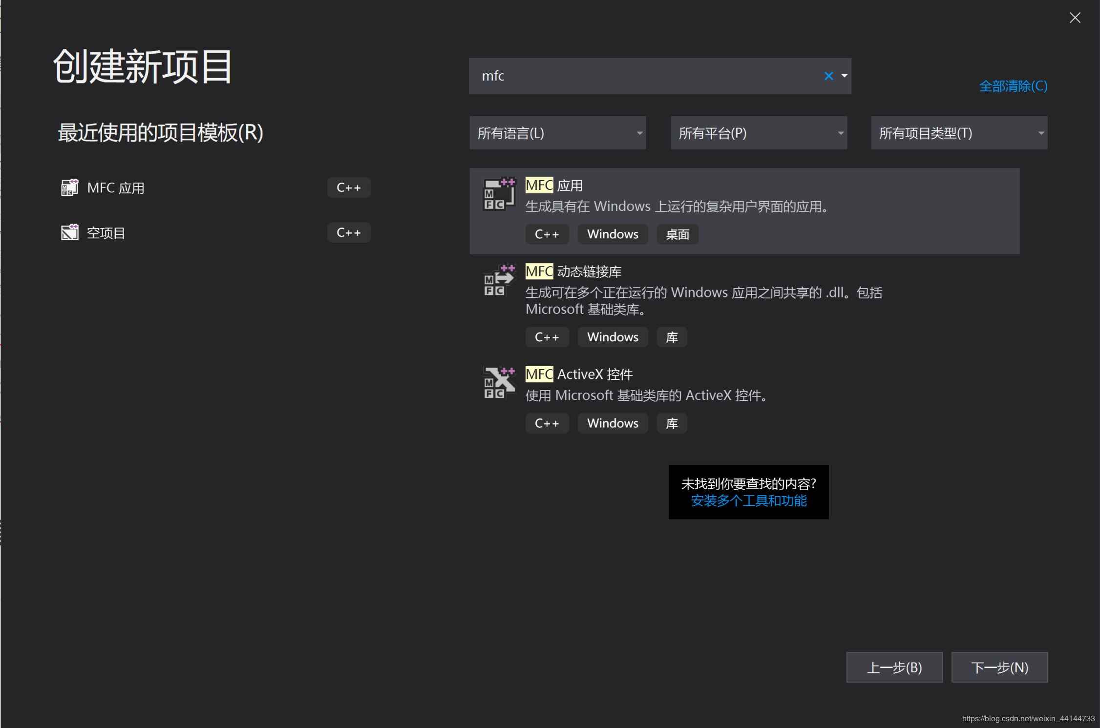 1、打开VS,点击创建新项目,得到下图,选择MFC应用(找不到的话可以像我一样直接搜索,搜索不到的话说明你没安装MFC环境)
