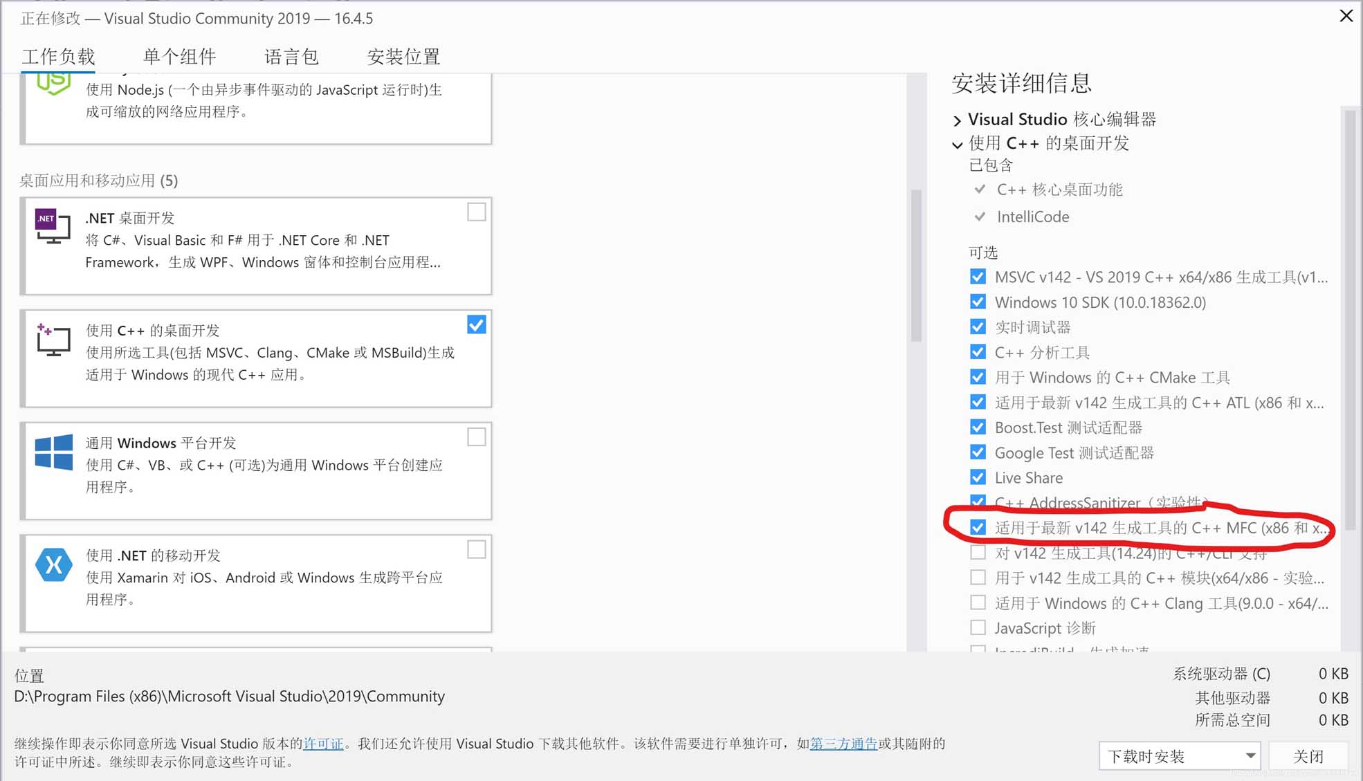 找到使用使用C++的桌面开发选项,便能找到如图所示的MFC组件,安装它