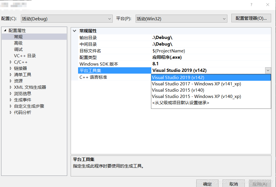 图片中为解决后的界面,实际情况应为列表中有VS 2019(v142)和VS 201?(v140),且VS 201?后有(未安装),201?指项目原本开发工具
