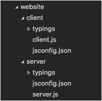 在更复杂的项目中,您可能在工作区中定义了多个 jsconfig.json 文件。 您希望这样做,这样一个项目中的代码就不会被建议作为 IntelliSense 在另一个项目中进行编码。 下面是一个带有客户端和服务器文件夹的项目,展示了两个独立的 JavaScript 项目。