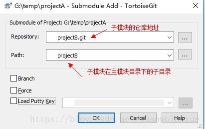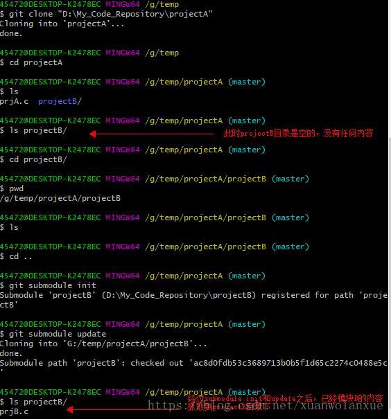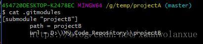 注: 这个submodule的 子目录指定时不能以 “/”结尾, 比如上面的命令,就不能写成 projectB/ 这个样子。