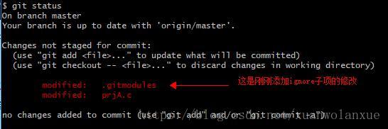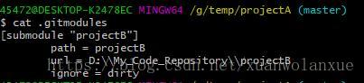 可以看出,之前 “modified: projectB(modified content)” 已经不见了, 此时对修改后的.gitmodules文件进行commit和push, 之后在查看status或做commit时就可以忽略掉对子模块B修改的部分了。